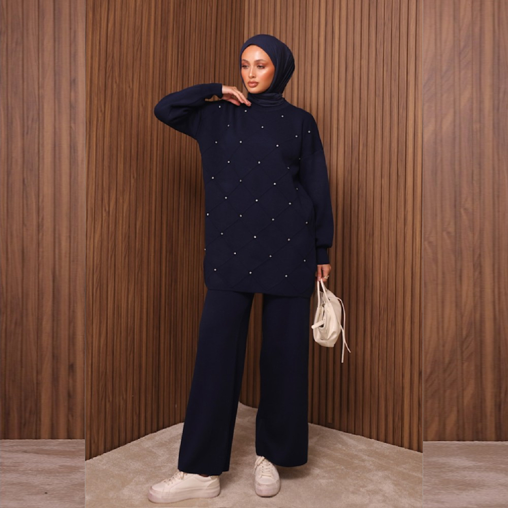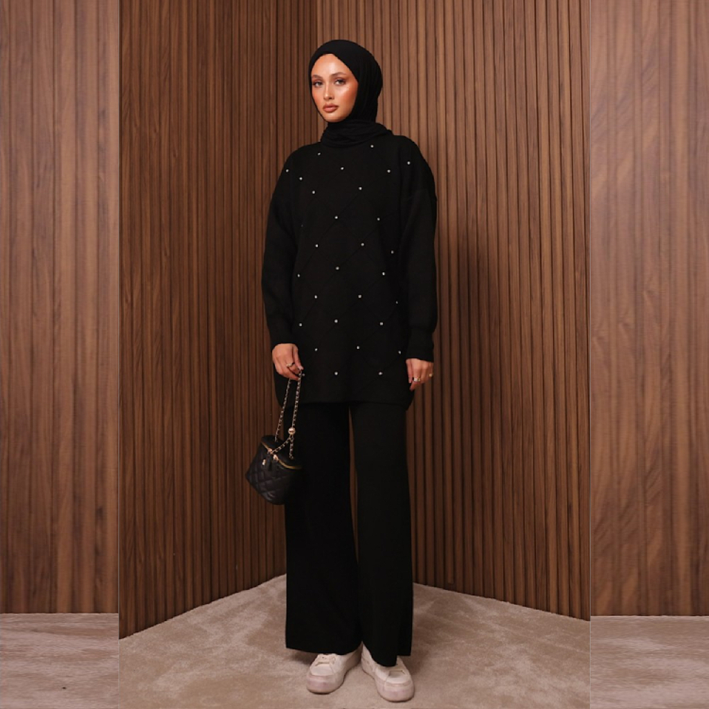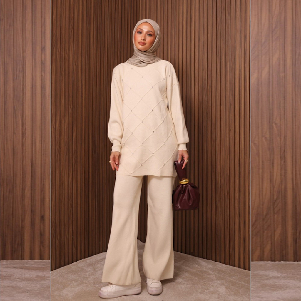 Ensemble féminin en maille douce décoré de perles délicates, alliant élégance et confort. Importé de Turquie avec une qualité premium, il conserve sa forme et sa couleur même après plusieurs lavages. Parfait pour un look chic au quotidien.